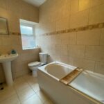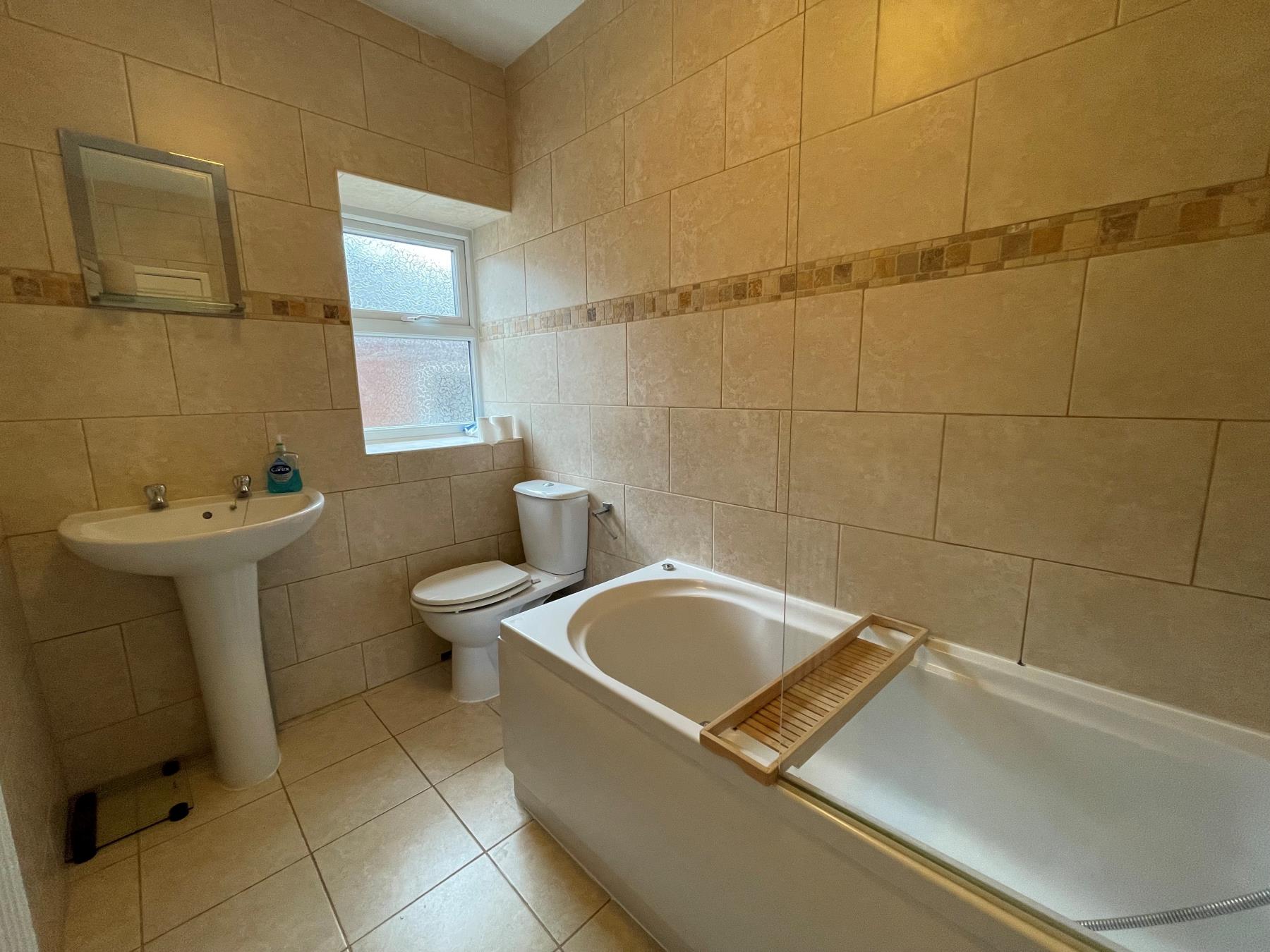 Modern suite comprising a rectangular paneled bath with shower fitment to mixer tap, pedestal hand basin and low level flush W.C. Modern tiled walls and floor.