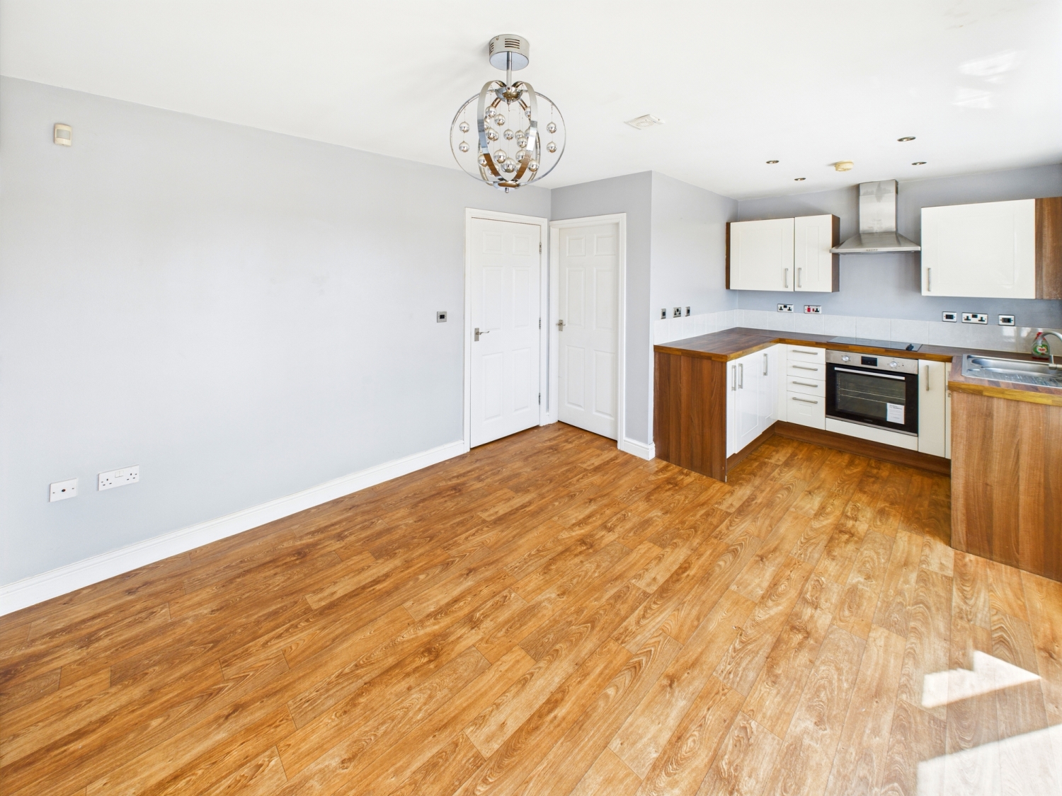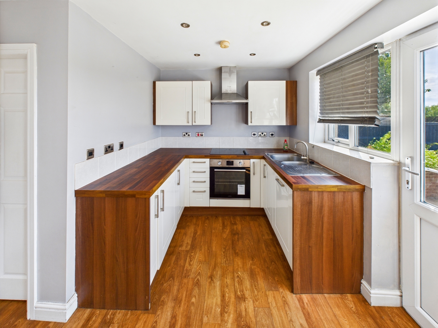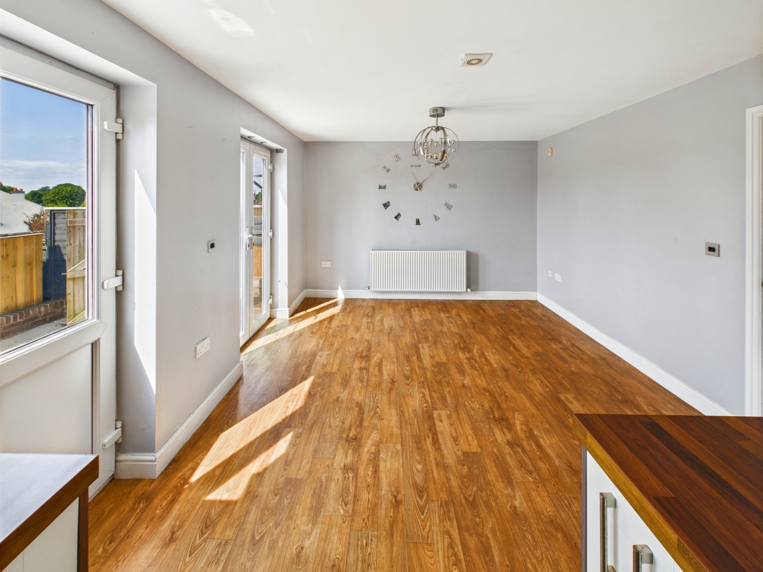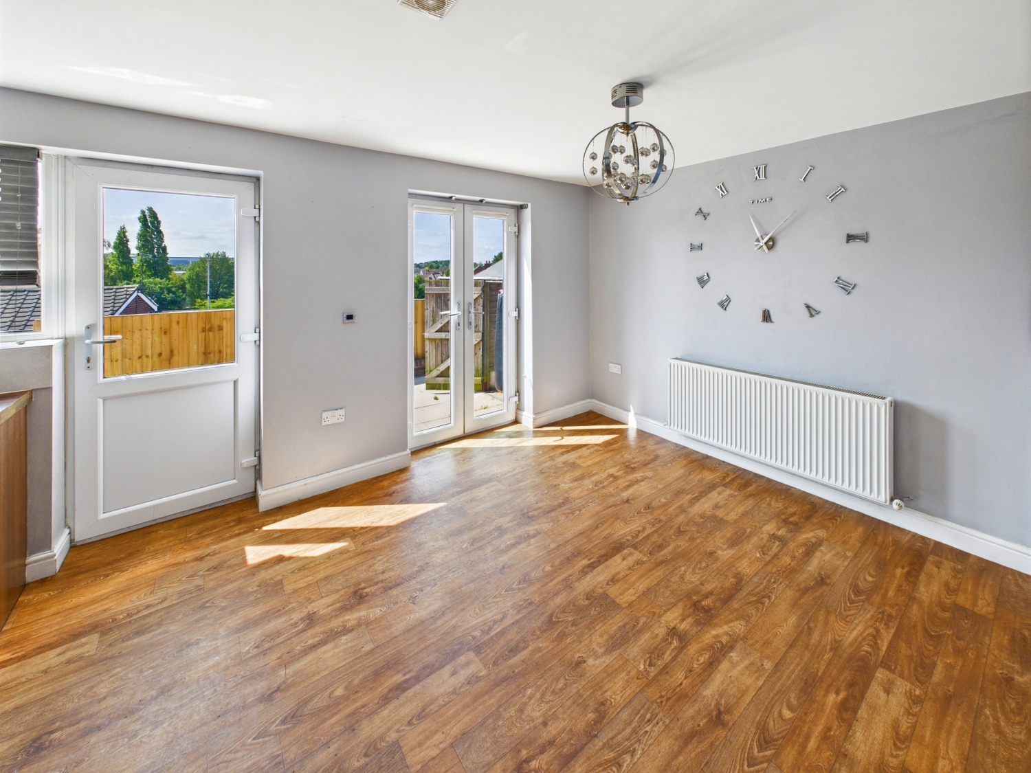 Kitchen - 18'4" x 11'6" - With a range of wall and base modern kitchen units, complementary work surfaces over. A stainless-steel sink drainer and mixer tap. Electric oven hob and extractor fan over. There are spotlights to the ceiling. A dining area with patio doors which lead out to the rear garden. Gas central heated radiator A door leads into the utility room.