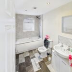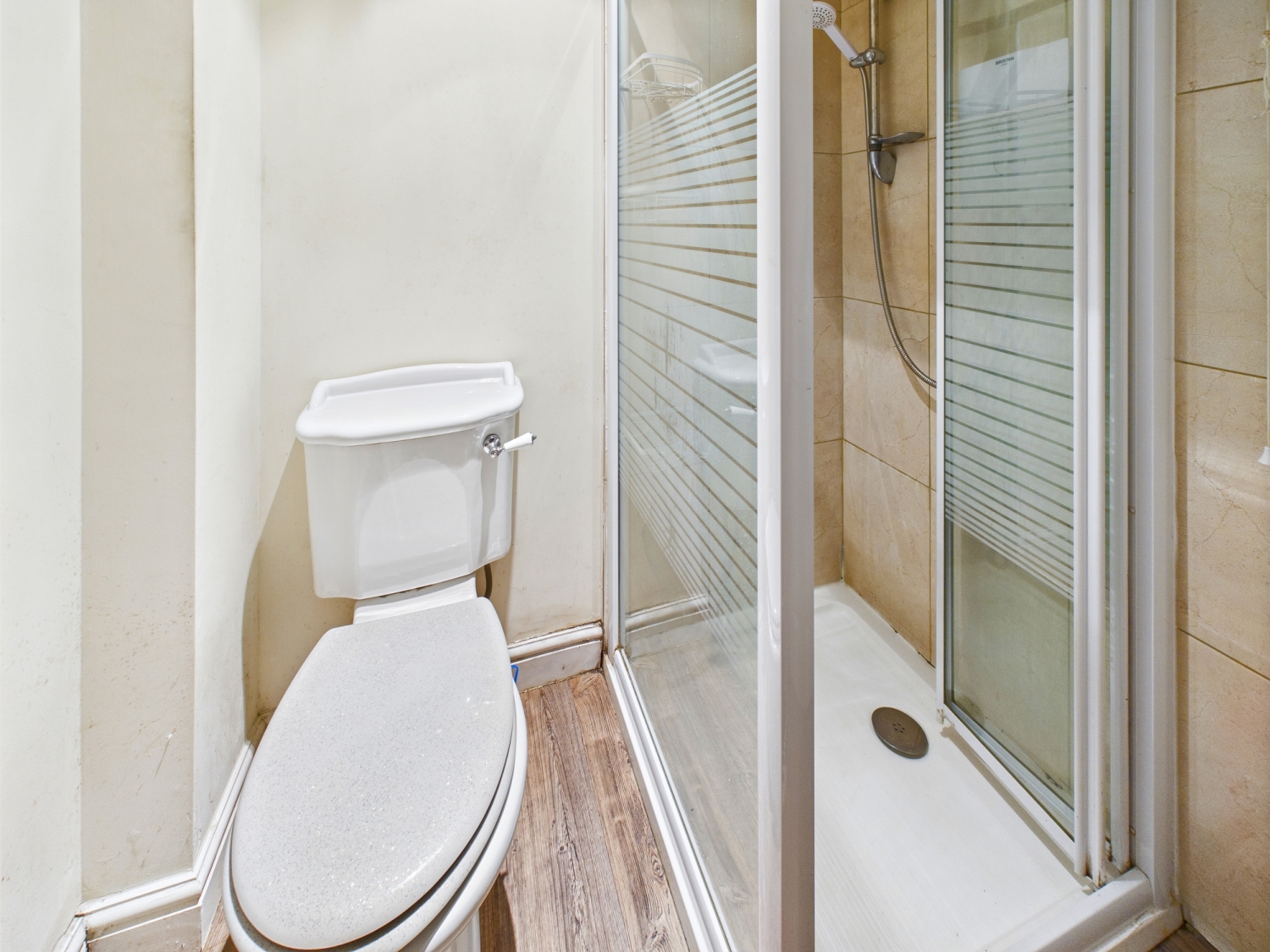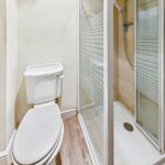 Ensuite - 5'7" x 5'8" - Toilet with a low-level flush shower cubicle with electric shower. Towel radiator and a wash hand basin.