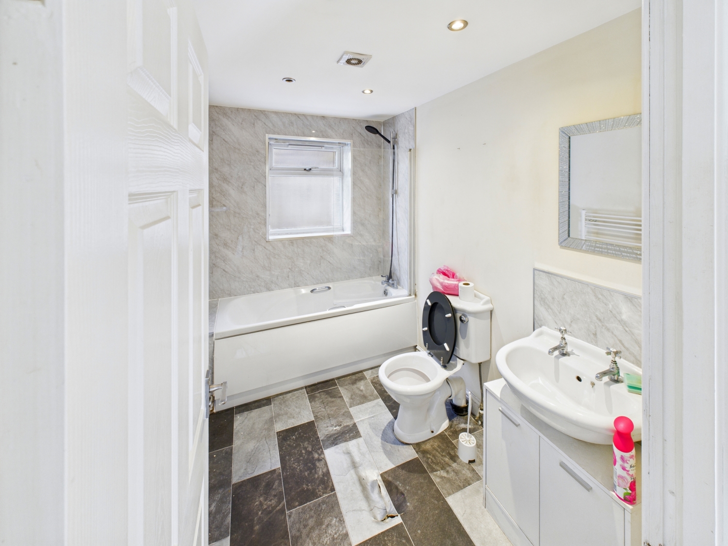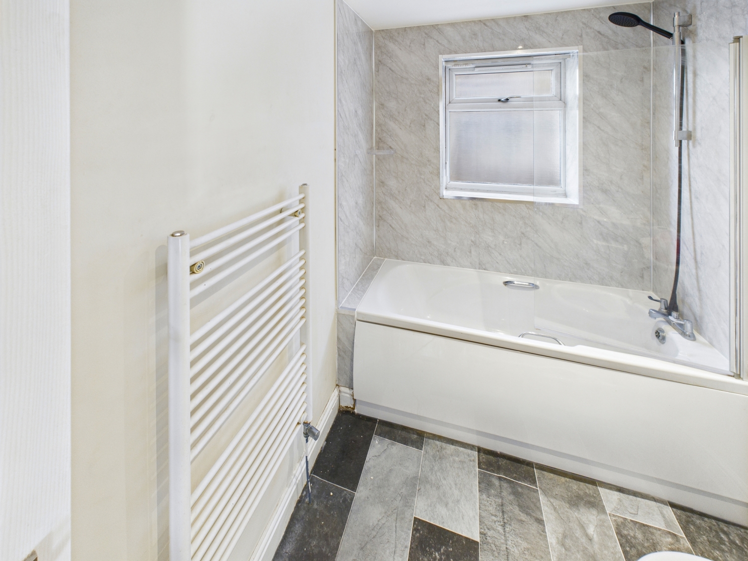 Bathroom - 8'11" x 5'10" - A bath with mixer tap and shower attachment over, glass partition shower screen. UPVC double glazed window to the side elevation. Spotlights and extractor fan to the ceiling. A towel radiator and a sink with a vanity unit below toilet with a push flush.